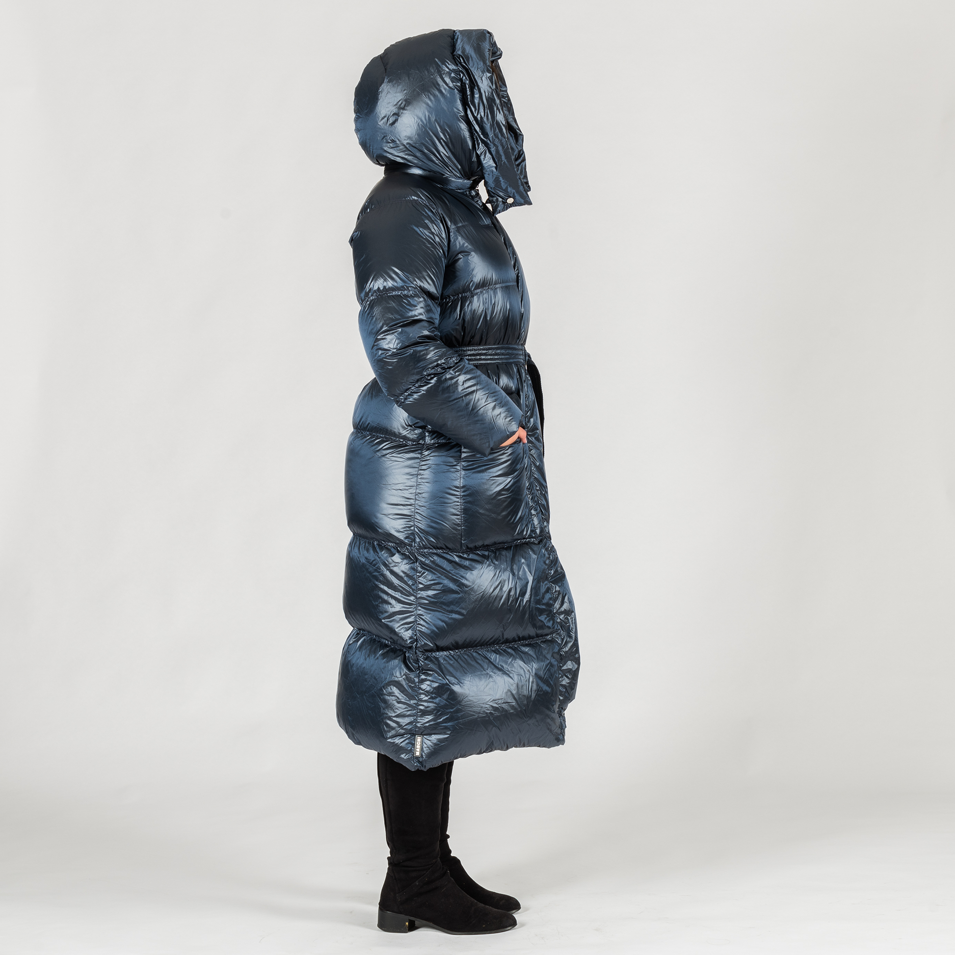 Step confidently into winter with the Steel Blue Sport 19 Long Down Coat, a masterfully crafted women’s puffer jacket by Marchi, the acclaimed Ukrainian outerwear label now available in Australia. With its elegant trapeze silhouette and voluminous hood, this long down coat delivers a refined take on cold-weather dressing—where functionality meets timeless style.