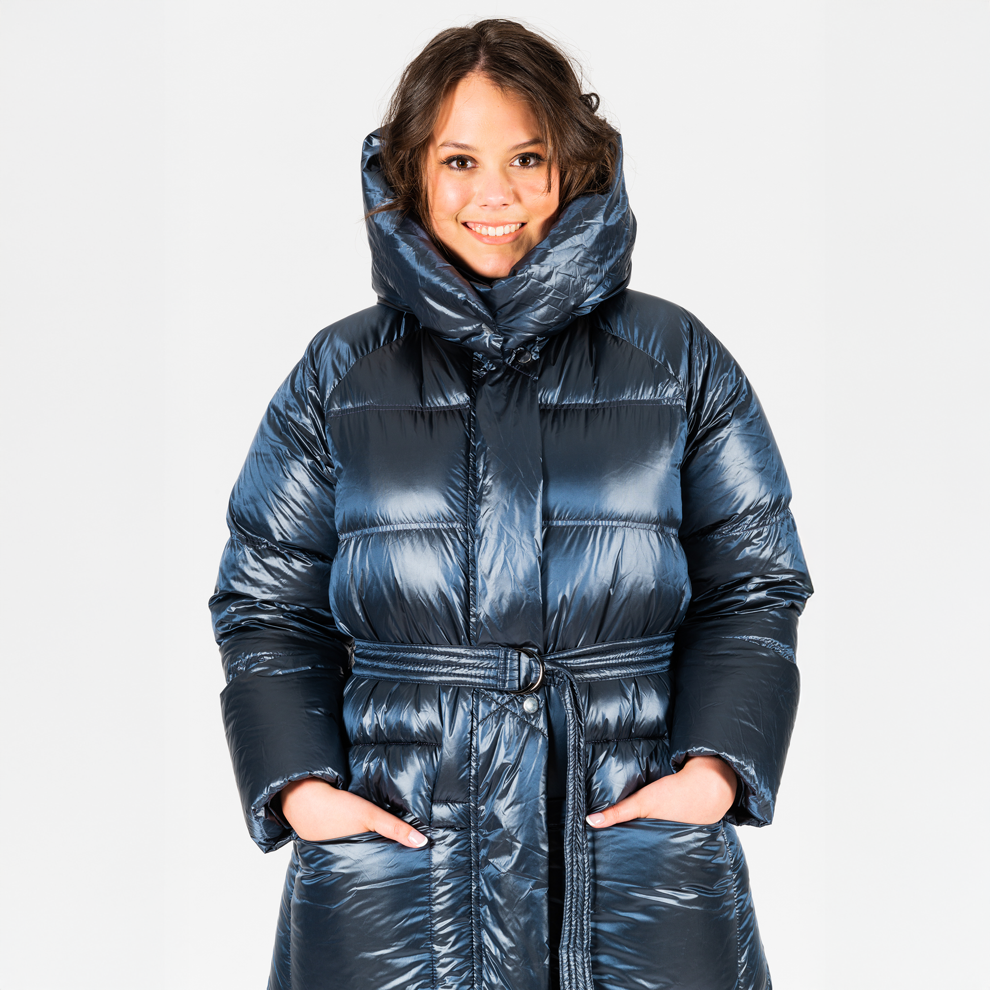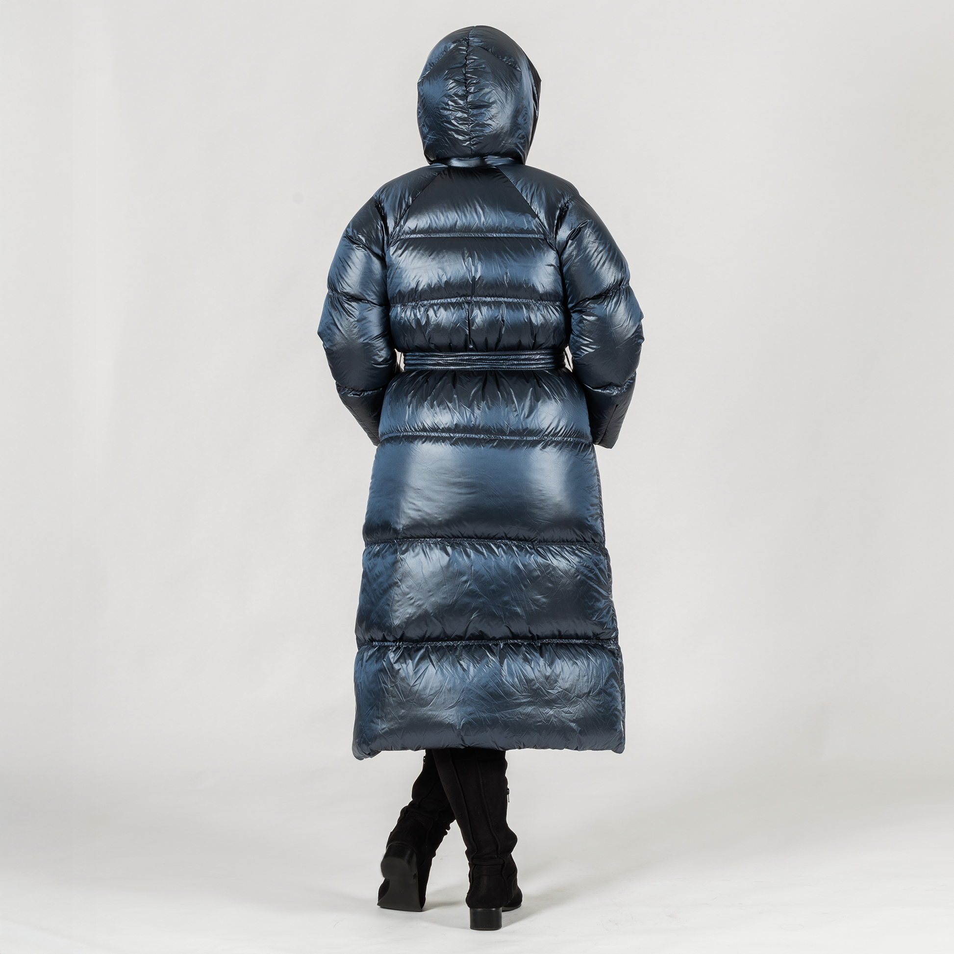 ✔ Women’s long down coat in sleek steel blue